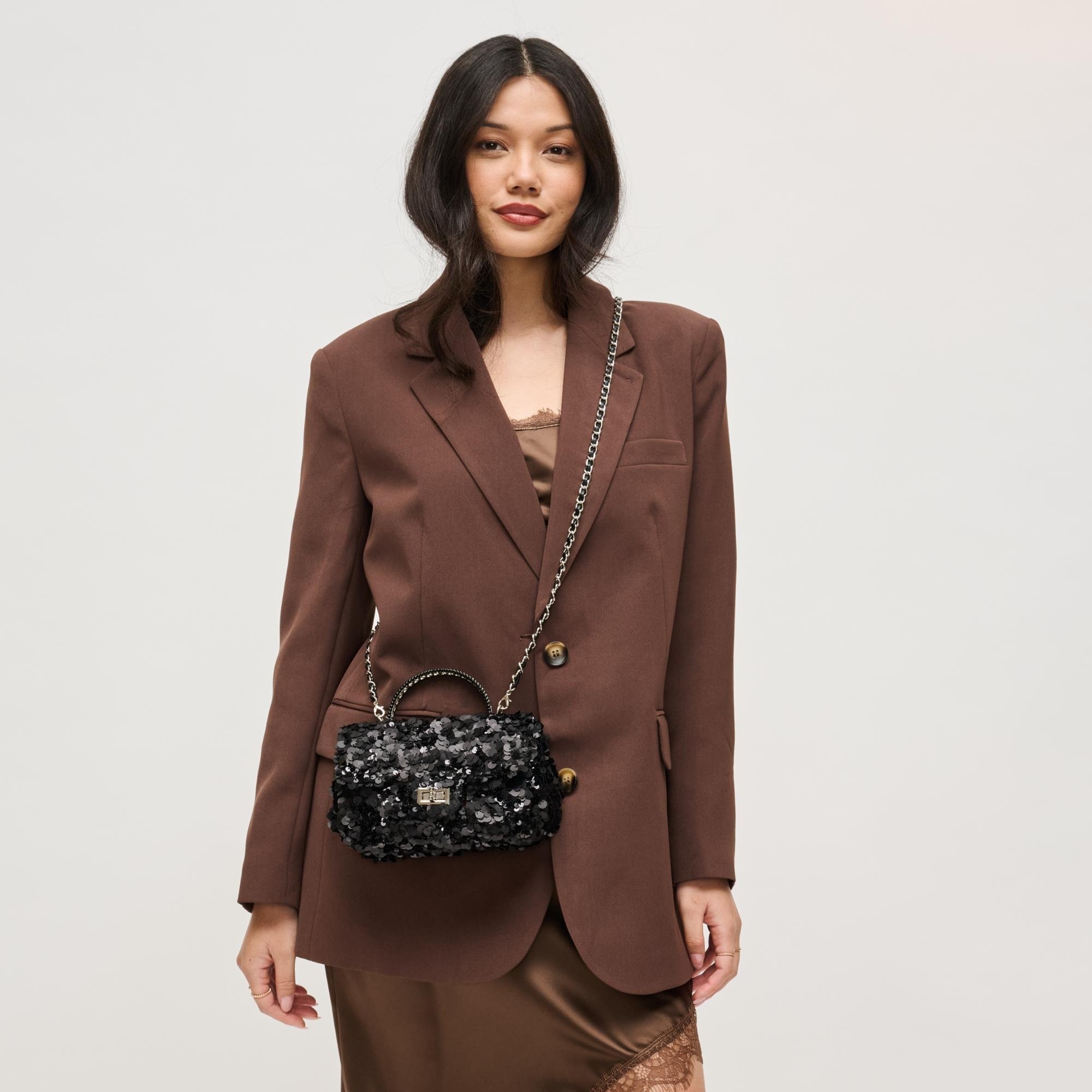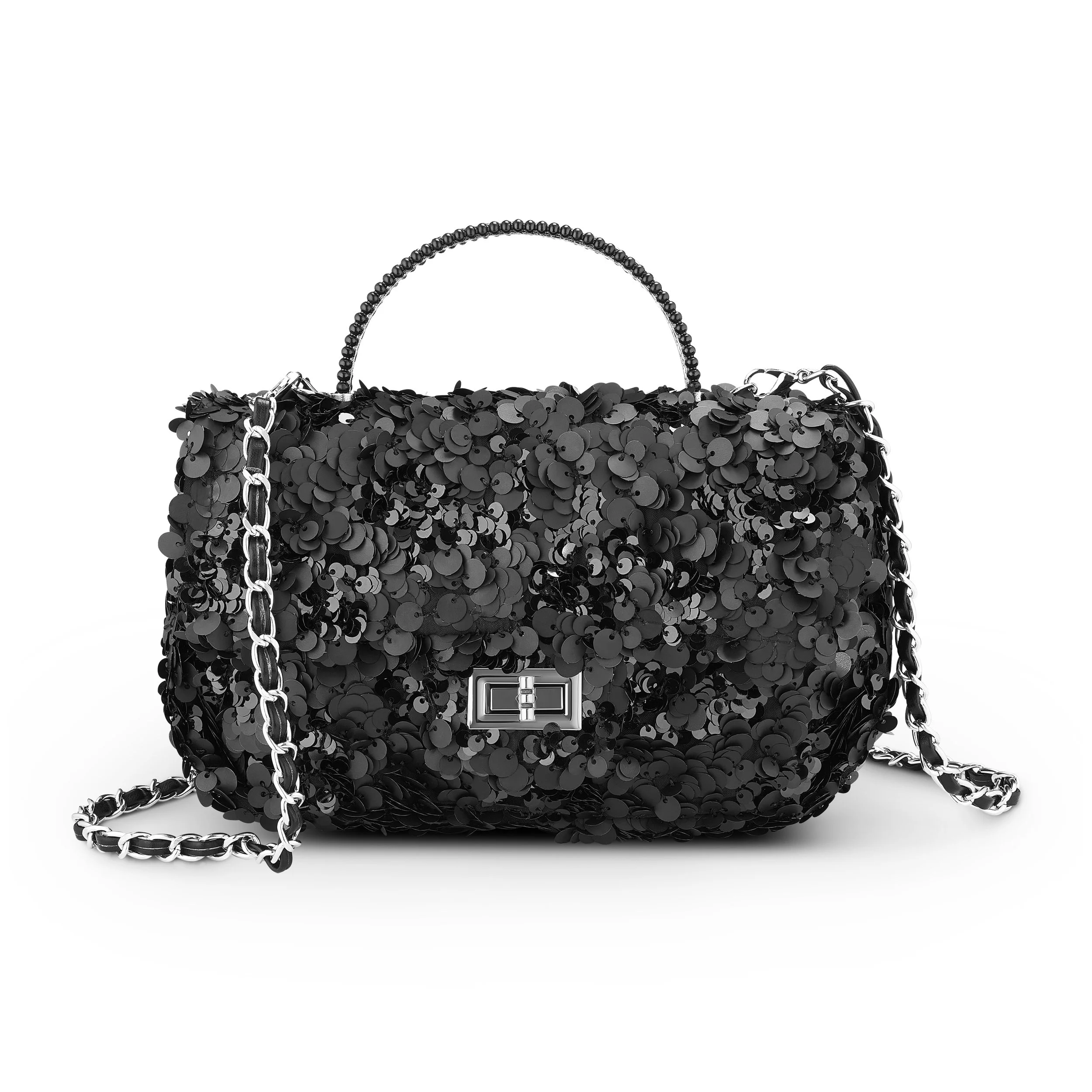 Sequin-covered flap bag with a sculpted beaded top handle — Ella Evening Bag. All-over sequins catch light for modern glamour, while the chain-link shoulder strap and secure turn-lock keep essentials close.