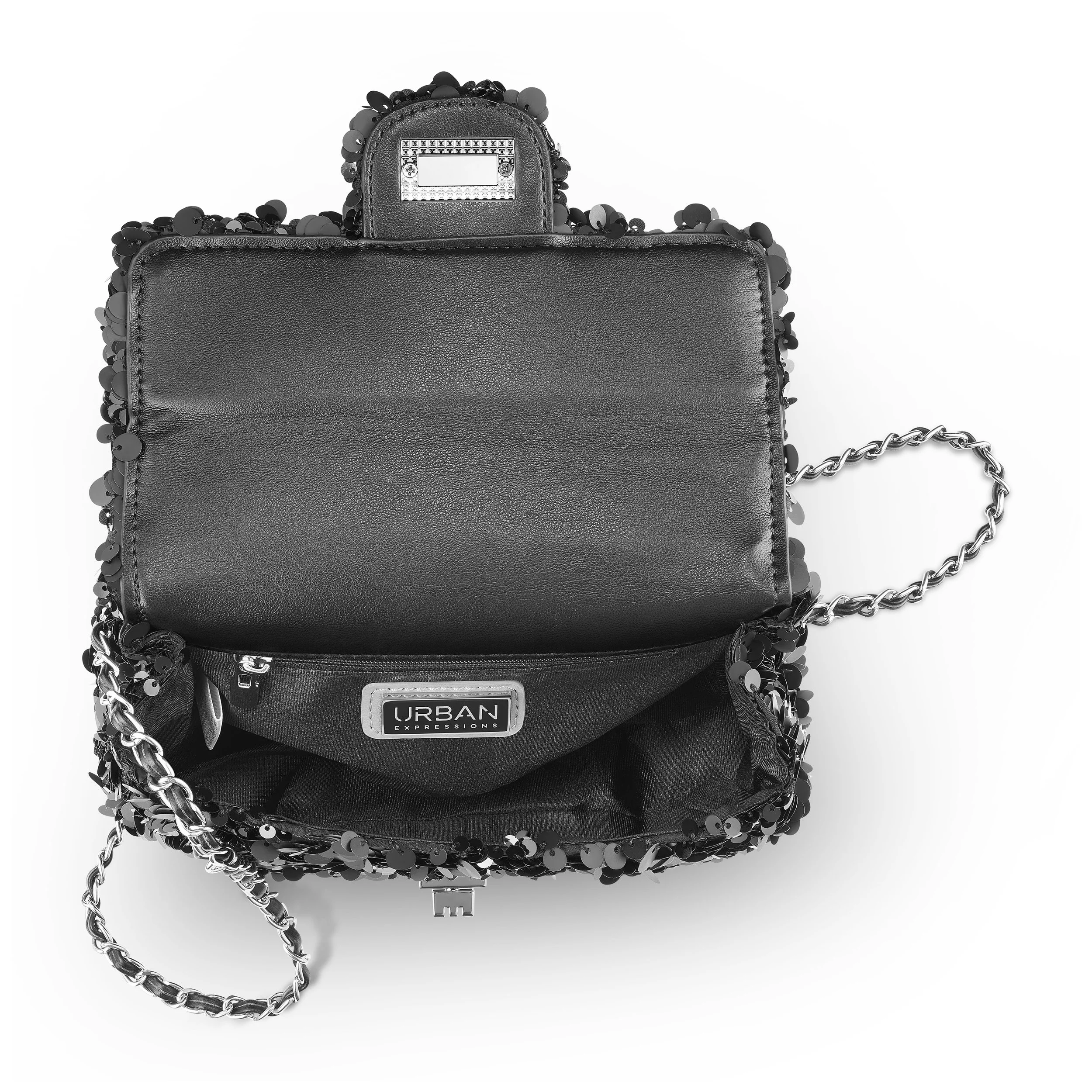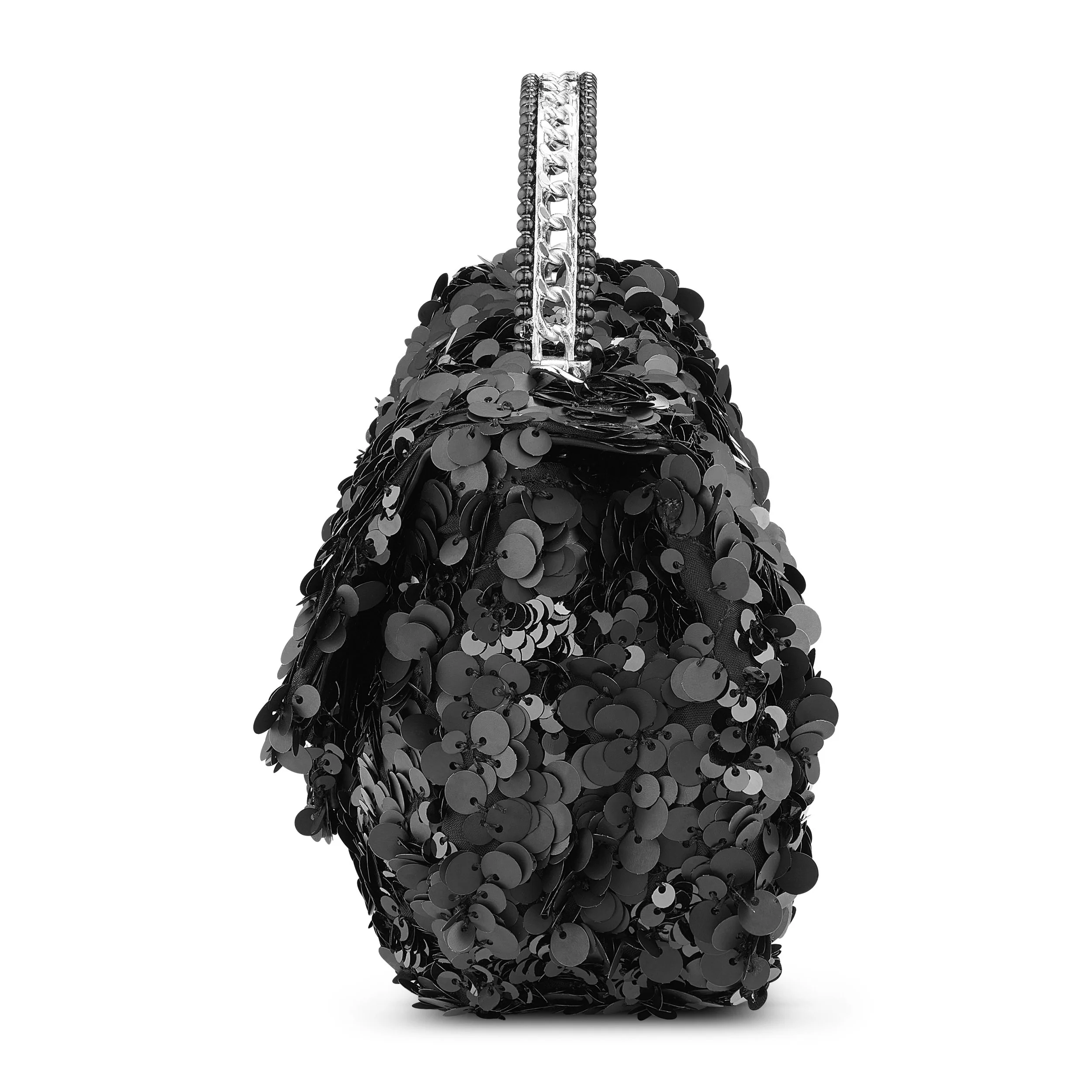 *Exterior Details: glossy sequin exterior envelops a structured rectangular body, plus a silver chain strap for shoulder or crossbody carry and a beaded top handle for hand carry. *Interior Details: satin-lined interior opens to a single main compartment with a zip pocket to secure small valuables and enough depth to organize a phone, compact wallet and keys.
