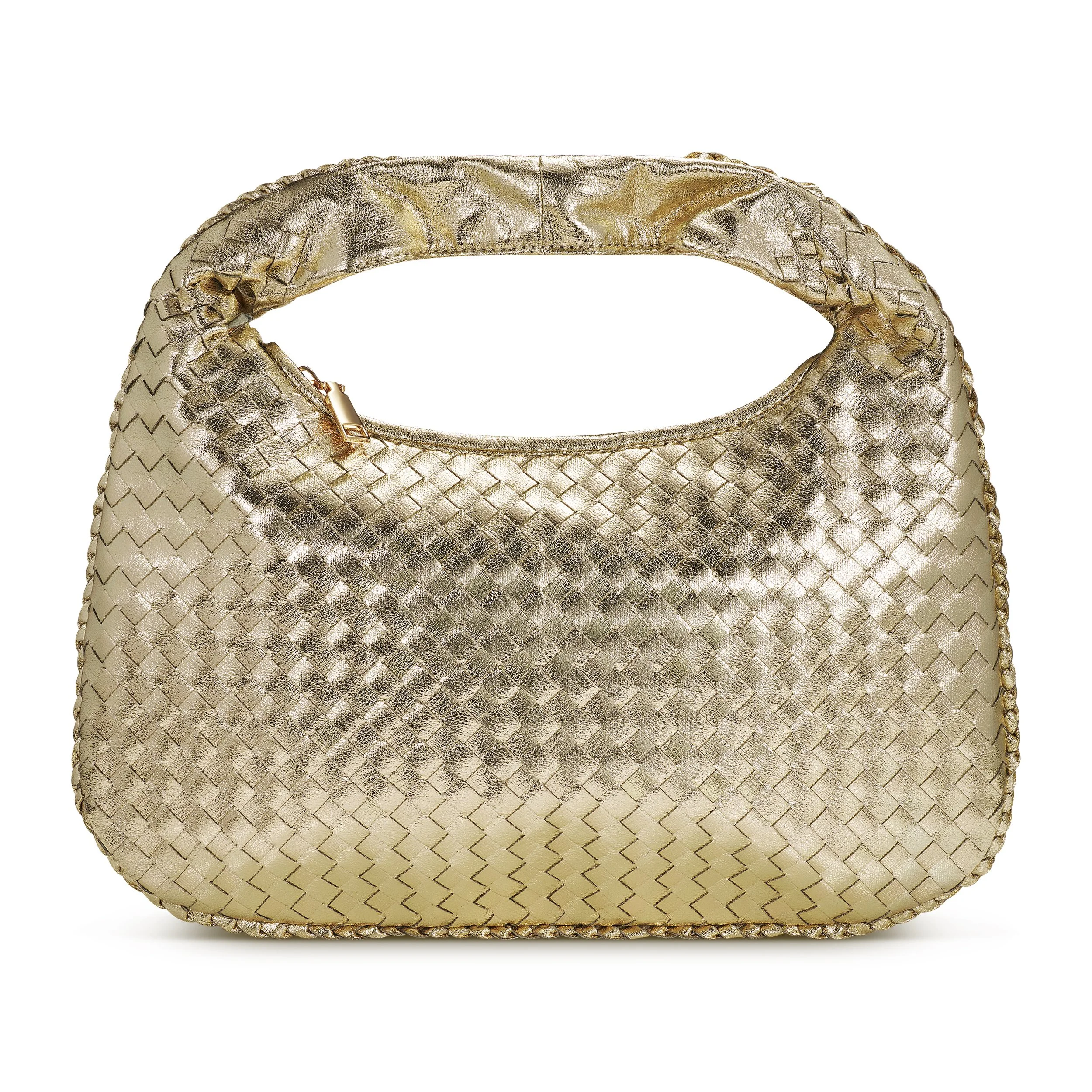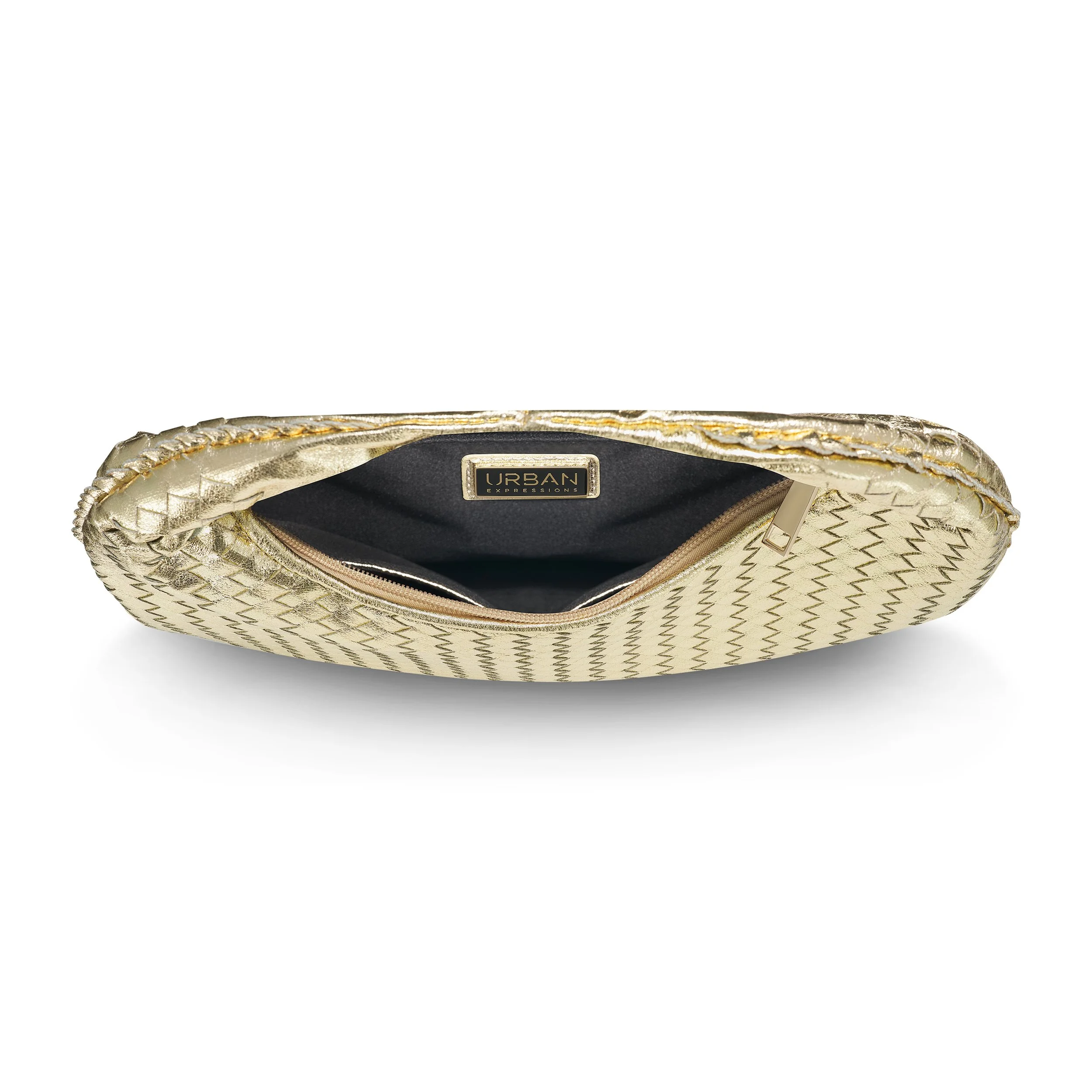 Crafted from sleek vegan leather, this beauty features a stylish woven design with eye-catching braided side details and elegant gold hardware. The zipper closure keeps your goodies secure, while the fabric-lined interior ensures everything stays in place with a zip pocket and two slip pockets for ultimate organization. Perfect for those days when you want to blend fashion with functionality effortlessly!