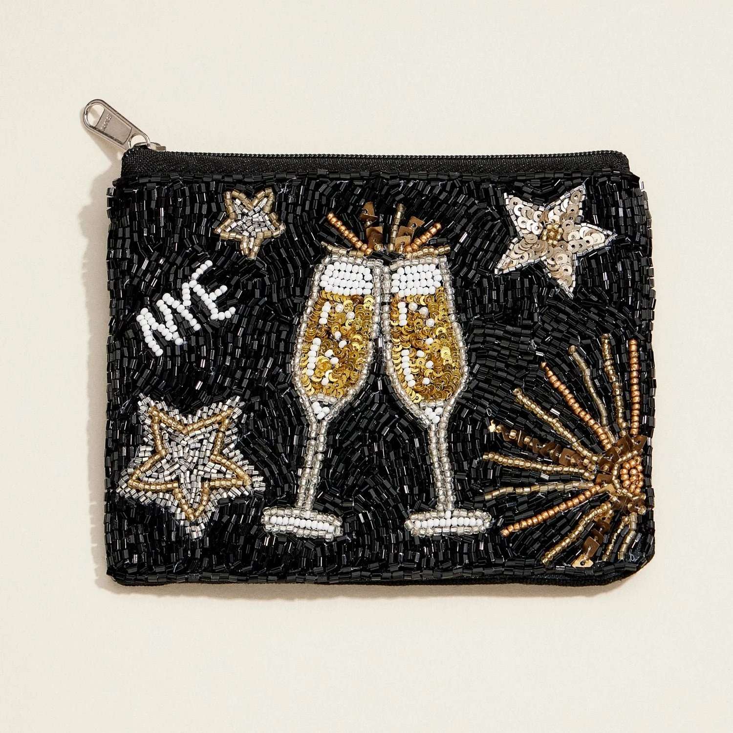 Ring in the new year in style with this dazzling New Year's Eve beaded clutch! Featuring intricate beadwork of champagne glasses, fireworks, and shimmering stars on a sleek black background, this festive pouch is the perfect accessory for your NYE celebration. The compact size makes it ideal for carrying your essentials while the secure zipper closure keeps everything safe. Whether you're heading to a party or a glamorous night out, this sparkling statement bag is a must-have for your festive wardrobe!