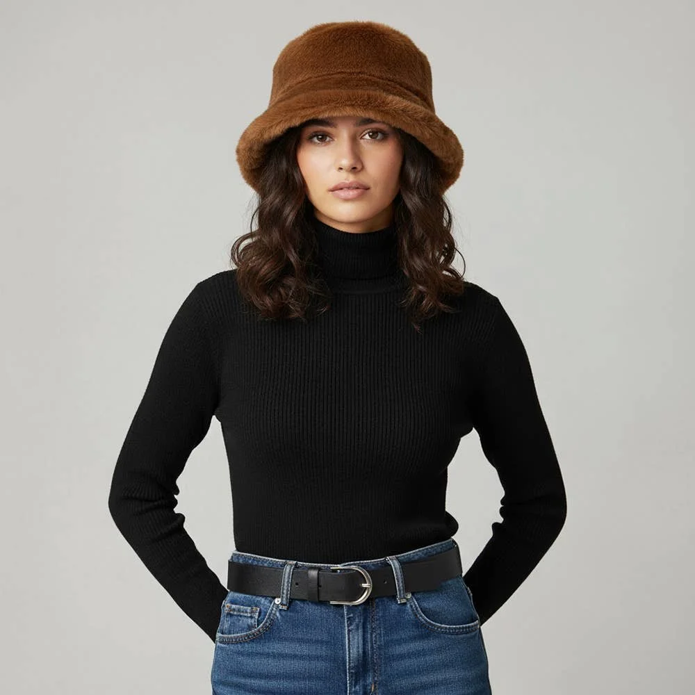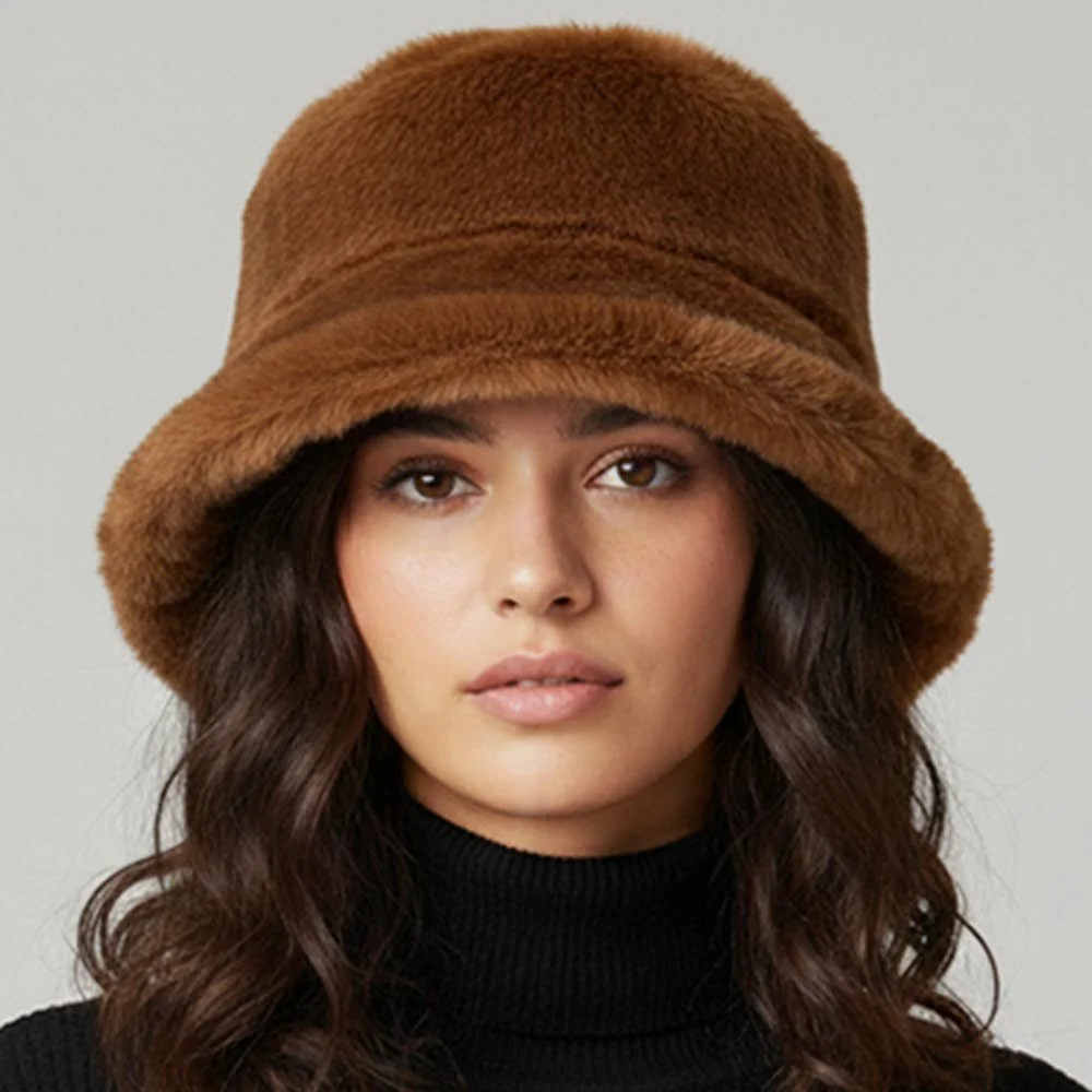 Cozy bucket hat featuring a soft faux fur plush design, perfect for adding warmth and style to cold-weather outfits. This chic winter accessory offers a trendy and comfortable fit, ideal for both casual wear and fashion-forward looks.